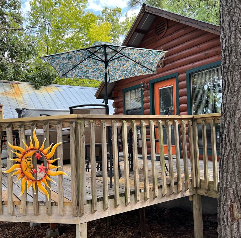 Our Sunrise cabin is located on the shoreline overlooking the water offering great lake views. You have access to a boat dock for easy convenience of all lake activities, whether its fishing, swimming or boating, etc. You will enjoy your own private hot tub, with an outdoor TV, along with grilling choices of using a charcoal or gas grill.
